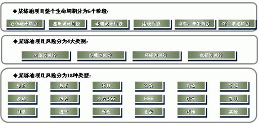 能源和石化行业企业的工程项目数量多、投资大、周期长、技术复杂,而且每个项目包括从设计、采购、施工到验收和运营的众多环节。与其他行业相比,该行业的风险管理重点在于工程项目风险,其特点表现在风险因素种类繁多、涉及面广,多种风险因素同时并存且相互交叉影响,不同阶段的风险表现和后果存在差异。因此,能源和石化行业企业的风险识别、测评和控制的方法也各不相同。