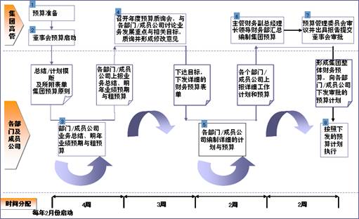 集团公司财务部根据自己的发展规划、预算执行情况和计划完成情况以及市场情况,编制集团公司长期规划和年度经营计划,并将各项指标分解下达给各成员公司。各成员公司根据集团公司下达的各项指标和自身具体情况编制年度预算,上报集团公司审批。集团对成员公司管理控制力还体现在指导各成员公司制订预算上拥有最终决定权。经批准后的预算和计划一起下达给各成员公司,据以指导其经营活动。预算执行过程中,集团公司应根据实际执行情况随时调整偏差,保证预算的完成。