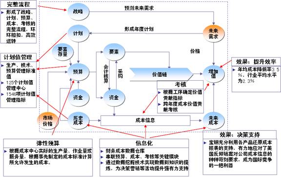 首先,宝钢的预算成本已经形成了战略、计划、预算、成本、考核的完整流程,环环相扣,高效运转。其次,宝钢提炼多年预算成本管理经验,形成计划值管理模式。形成生产、技术、预算管理标准值,由 125 个计划值管理中心管理 1,546 项计划标准值。第三,在考核方面,根据工序确定价值贡献指标,并形成跨年度成本价值贡献考核,可以追溯三年的历史成本数据。第四,建立了预算成本信息化系统。建立了财务成本数据仓库,并用信息平台串联预算、成本、考核等关键模块,并通过数据挖掘技术实现数据到知识的提炼,为决策营销等活动提升强有力支持。