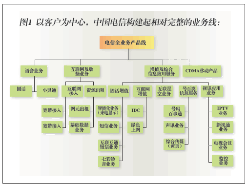 中国电信从集团以客户固话业务起步,在客户界面改变公司组织架构,建立以客户为中心、前端驱动后端的管理机制和流程体系;在业务界面,建立一系列客户品牌,并以之统领、牵引各项业务的开发和推广。至2008年5月,中国电信客户领域覆盖个人客户、家庭客户、政企客户;业务领域覆盖固话业务、无线市话业务、数据业务、互联网业务、宽带业务,形成了以客户为中心驱动业务拓展和公司发展的模式(见图1)。