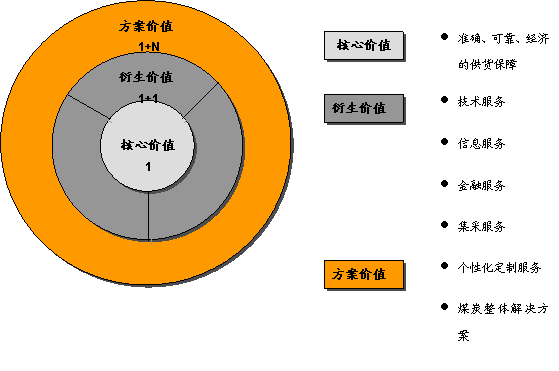 基于煤炭行业将不断市场化和煤炭产品为信息不对称产品的研判,并通过广泛的客户需求调查,我们发现除了最基础的准确、可靠、便捷、经济的煤炭交付需求(我们定义为核心价值,Ι)外,不同的客户在此基础上还有额外的煤炭物流、信息服务、技术服务、金融服务、集采服务等某一单方面的附加价值需求(我们定位为衍生价值, Ι + Ι) ,更进一步的很多客户有以上附加价值的组合需求,比如煤炭燃烧整体解决方案或个性化的定制服务,我们把这多点价值组合定义为方案价值(Ι +N ),以上价值统称为价值包(见下图二)。通过这多样化、可选择、个性化的价值主张,至少可以达成三个方面的作用: