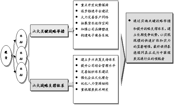 在系统进行新的发展战略设计前,铭远咨询还深刻分析了煤炭流通行业存在的机会和威胁,对影响煤炭流通企业商业模式构建(同时也影响发展战略制定)十个方面因素进行了深入分析:( 1 )产业结构: 煤炭行业上下游企业相对分散,特别中间小流通商,约 3 万家,集中度不高;( 2 )市场化:煤炭行业的市场化将是不断演进的过程;( 3 )产品属性:煤炭产品是非标准化产品;( 4 )交易成本:煤炭行业信息不对称情况广泛存在,交易成本高;( 5 )运转效率:煤炭行业的总体效率欠佳,存在大量集约改进的机会;( 6 )市场容量:煤炭流通产业容量足够大,第三方流通市值约 3000 亿元;( 7 )问题很多:煤炭行业参与主体较多,供需各方均有不同难处,这些难处的解决就有流通服务存在必要;( 8 )环保要求:国家对节能减排的要求趋于严格;( 9 )区域结构:中国煤炭储存地和使用地的错位,加上中国特殊的市场环境,流通将大量存在;( 10 )国家政策:中国煤炭储存地和使用地的错位,流通将大量存在。 充分论述了中国煤炭流通市场长期存在的必然性,有力论证了泰德煤网商业模式存在的合理性和科学性,为利用商业模式思考发展战略提供了大量的理论和实践支持。