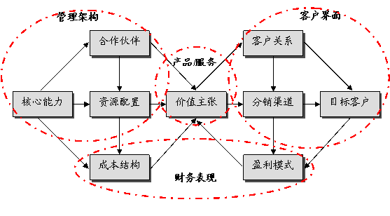 从上述案例可以看出,商业模式是个系统论的概念, 铭远咨询将其进一步分为四大方面九个因素(如下图四),图中清晰表达了二重意思:一、商业模式是一个由各种要素组成的整体, 必须是一个结构, 而不仅仅是某个单一的因素;二、各组成要素之间必须有内在逻辑关系,这个内在逻辑关系把各组成部分有机地联系起来,使它们互相支持、共同作用,形成一个良性的循环,建立了一个从战略到行动的内在逻辑。