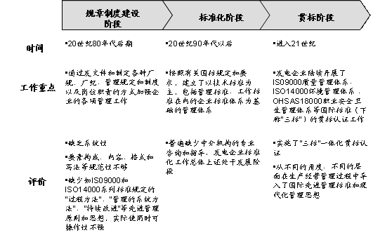 发电企业于 20 世纪 80 年代后期开始展开标准化工作,历经规章制度建设、标准化、贯标等三大阶段(见图 1 ),已经建立了比较完善的以制度管理为核心的管理体系。