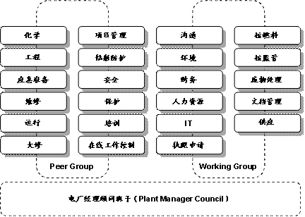 其中:改进流程( CAP )分为输入分析、问题处理系统、输出分析,有效地提高了对各种问题和事件的处理能力和解决效率;监控程序( NOS )组织结构中分为业绩评估、审计、员工关注及程序四大功能;建立按核电运营的各个专业划分为功能域以支撑管理组织结构,各功能域的最高负责人称为功能域经理( CFAM or SFAM ),由各功能域经理组成专家小组( Peer Group or Working Group ),见图 5 。